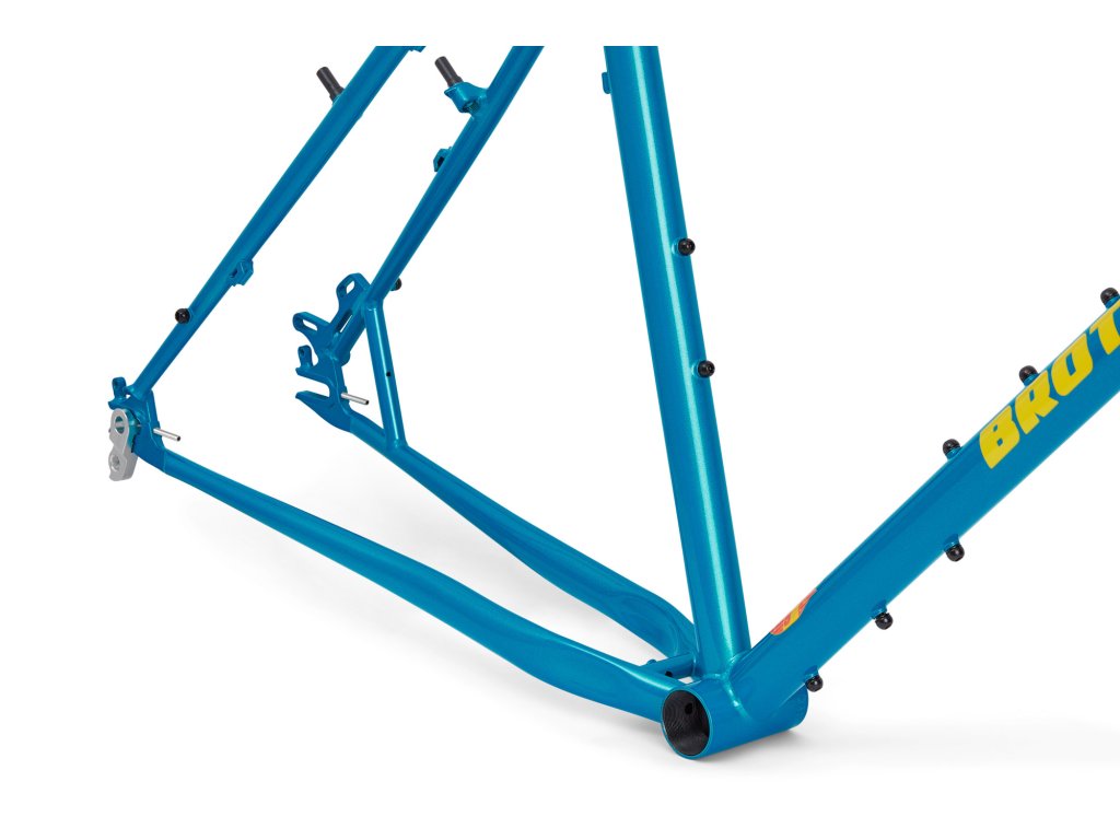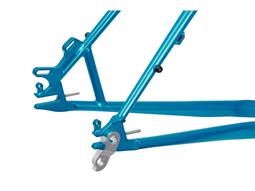 Vzadu jsme použili horizontální patky pro snadné nastavení jedné rychlosti, nebo použijte naši šikovnou vložku pro přehazovačku, která je součástí rámu, pokud chcete používat různé převody. Vpředu je odolná segmentovaná vidlice s trojitými úchyty na každé vidlici pro větší nosnost, například úchyty pro náklad nebo Anything Cage.